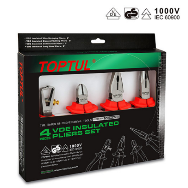 The TOPTUL 4PCS VDE Insulated Pliers Set is a high-quality and safety-certified tool kit designed for professional electricians and industrial technicians. Engineered for performance and protection, this pliers set is ideal for working on live electrical circuits, making it an essential tool for electrical maintenance and installation tasks.