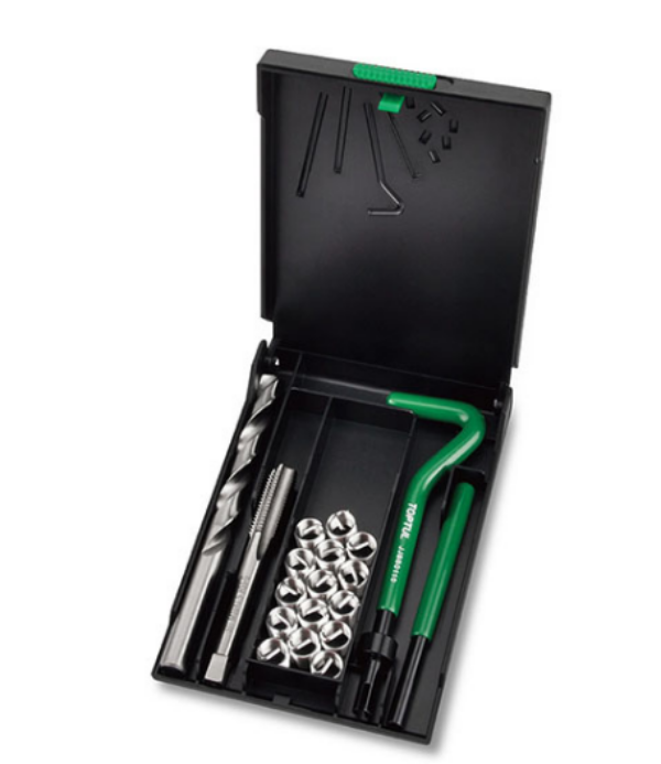 The Toptul threaded coil-insert repair kit is easy to use. First, the damaged thread is drilled and tapped to a larger size. Then, the coil insert is installed using the insertion tool, and the tang is broken off to complete the repair. This process creates a durable and reliable thread that can be reused multiple times.